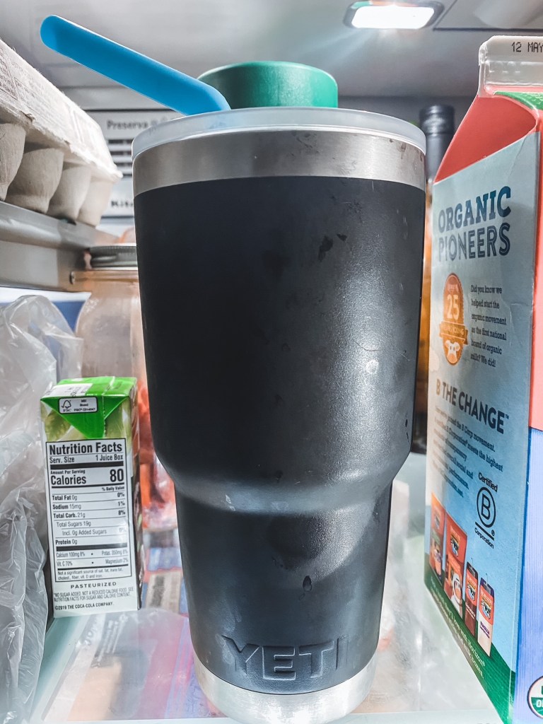 This morning after my alarm when off, and I got myself ready for the gym I remembered that I forgot to fill my cup with ice water and put it in the refrigerator the night before. Obviously, this isn’t a big deal but I try to be as quiet as I can in the mornings since everyone else is asleep when I leave. I searched for my cup and couldn’t find it. I finally looked in the fridge and there it was… full of ice water. Frank got it ready for me the night before after I fell asleep. To some, this may seem like a trivial thing, but for me it meant so much. Having kids is hard. It’s extremely fulfilling most days, but there are many days where you’re just exhausted/frustrated/infuriated… you name it! I was having one of those overwhelming moments last night, and forgot a few steps in my nighttime routine after having a difficult time getting our son to bed. The simple act of literally filling my water cup made this morning a little less hectic for me, and it made my heart smile.